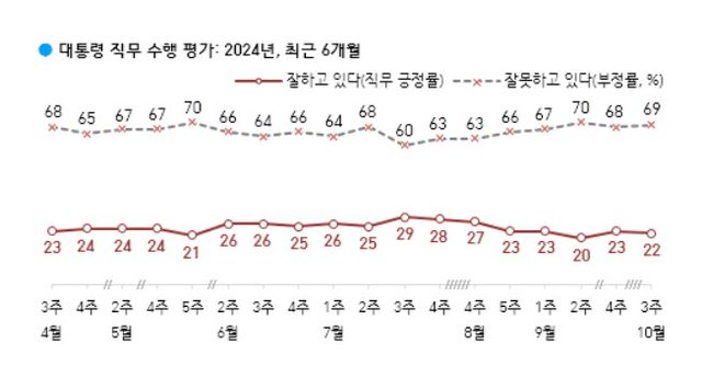 여론조사 전문기관 한국갤럽이 15~17일 실시한 조사에 따르면 윤 대통령 국정 수행에 대한 긍정 평가 비율은 22%였다. 직전 조사(23%)와 비교해 1%포인트 하락했다. 이 회사 조사에서 윤 대통령 지지율은 8월 말 이후 20~23% 박스권에 갇혀 있다. 반면 직전 조사에서 68%였던 윤 대통령 국정 부정 평가 비율은 이번 주 69%로 상승했다. 응답자 계층별로 봐도 국민의힘 지지층에서만 윤 대통령 국정에 대한 긍정평가(56%)가 부정평가(36%)보다 우세했다.