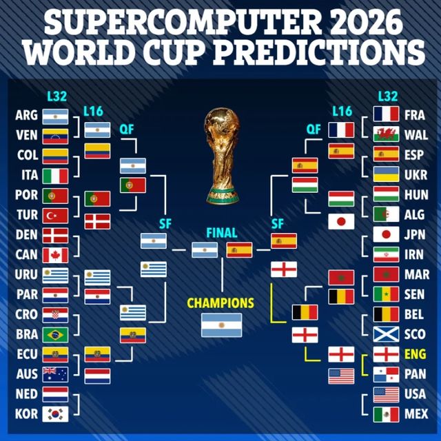 영국 일간지 '더 선'은 17일(한국시간) 슈퍼컴퓨터가 예상한 2026 북중미 월드컵 성적을 공개했다. 매체가 이 결과에 주목한 이유는 최근 잉글랜드 축구대표팀이 새 사령탑으로 토마스 투헬 전 바이에른 뮌헨 감독을 선임했기 때문이다.