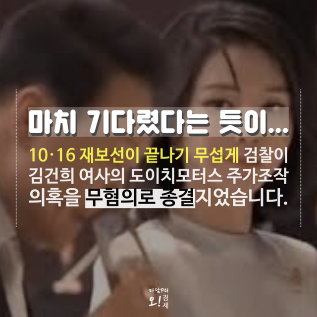 [프라임경제] 10·16 재보선이 끝난 직후 검찰이 김건희 여사의 도이치모터스 주가조작 의혹에 대해 무혐의 결정을 내렸다. 2020년 4월 고발장이 접수된 지 4년 6개월 만에 나온 결과다.