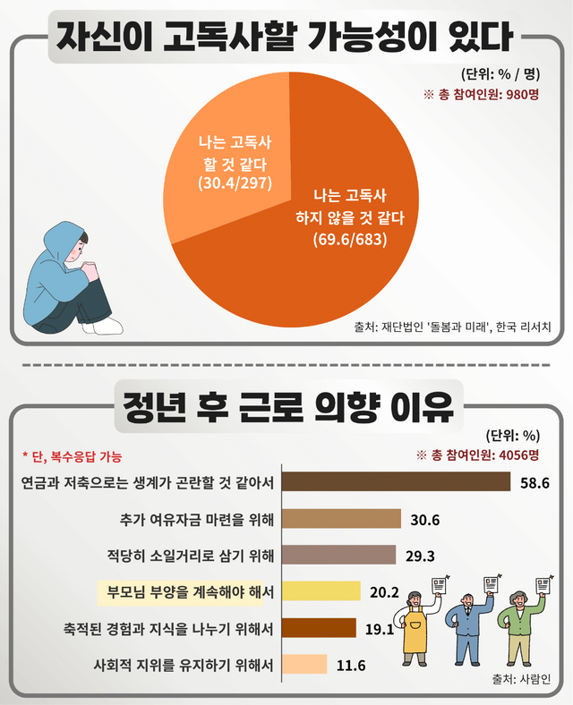 재단법인 '돌봄과 미래'는 한국리서치와 함께 1960년대 생 980명을 대상으로 설문조사한 결과 이들 중 약 30.4%인 297명이 자신의 고독사를 우려하고 있는 것으로 밝혀졌다. 10명 중 3명가량인 29%는 본인이나 배우자의 부모와 함께 살고 있다고 답했다. 부모가 있는 경우 44%가 월평균 73만원의 용돈을 준다고 응답했다.
