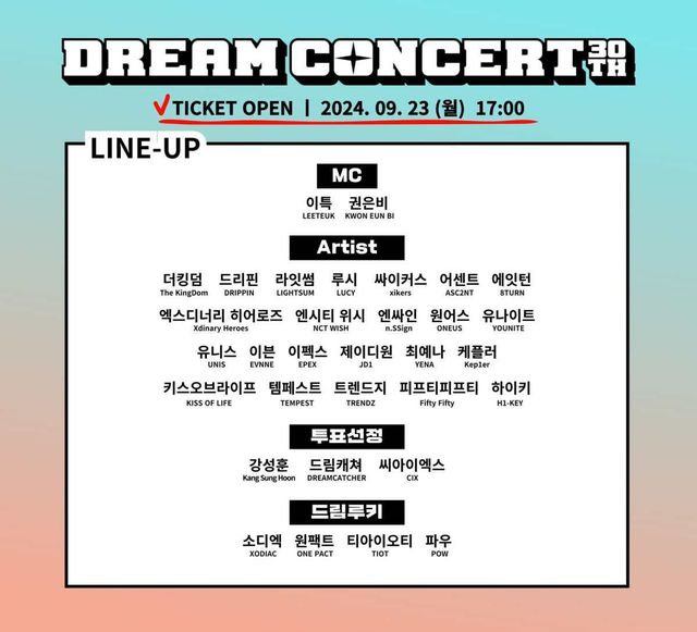 한편 ‘2024 드림콘서트’ 티켓팅은 지난달 23일 티켓링크에서 시작됐고, 전 좌석 2만 원(VAT 별도)에 판매됐다.