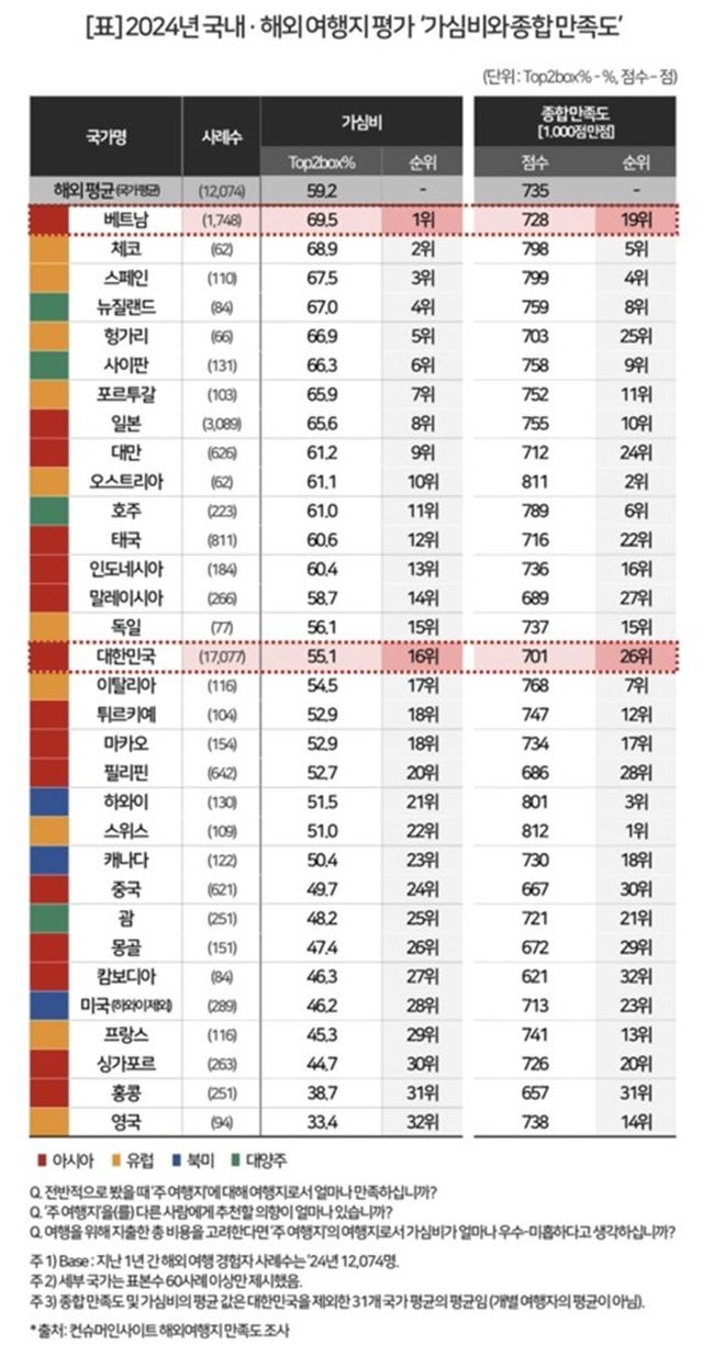 이러한 조사 결과는 여행객들의 선호도가 변화하고 있음을 나타내며, 비용 대비 만족도가 높은 여행지를 선호하는 경향이 뚜렷해지고 있다. 앞으로 여행업계와 각국 관광 정책에서는 합리적인 가격으로 질 높은 경험을 제공하는 것이 더욱 중요해질 것으로 전망된다.