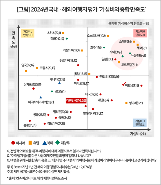 반면, 유럽과 미주 지역의 유명 관광지는 높은 물가와 만족도 면에서 기대에 미치지 못해 낮은 평가를 받았다. 한국의 경우 가심비와 종합만족도 모두 중하위권에 머물러, 개선이 필요한 부분이 많다는 점이 드러났다. 특히 먹거리 부문에서의 문제는 시급히 해결해야 할 과제로 지적됐다.