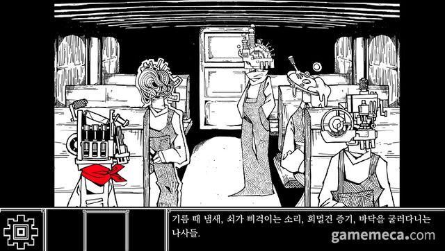 시작하며 만나는 칸 영국 산업혁명 시기의 노동자 계층을 상징하는 인물들과 함께 한다. 다음 칸으로 안내하는 핵심 캐릭터는 붉은 색으로 강조되며, 포인트 앤 클릭으로 필요한 물건을 전달하는 퍼즐을 푼 후에 대화 가능하다. 주변 인물과는 꼭 대화를 나눌 필요는 없지만, 이야기를 통해 시대상에 대한 자세한 내용을 확인할 수 있다.