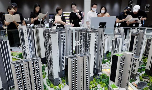 견본주택을 찾은 예비 청약자들이 아파트 단지 모형을 살펴보고 있다. / 뉴스1 자료사진