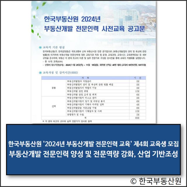 한국부동산원이 부동산개발 전문인력 역량 강화를 위한 '2024년 부동산개발 전문인력 교육' 제4회차 교육생을 모집한다.