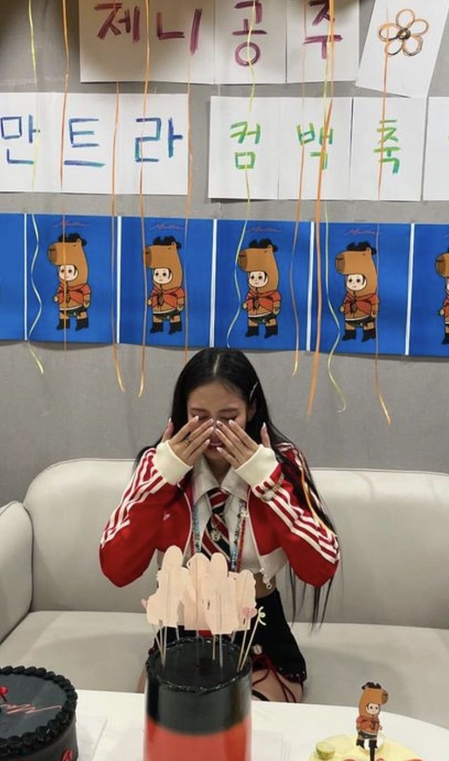 사진 속 제니는 ‘만트라’ 무대 의상을 입고 볼 하트로 사랑스러운 매력을 자아냈다. 특히 ‘제니공주 만트라 컴백축하’라고 적힌 대기실 안에서는 두 손으로 얼굴을 가린 채 눈물을 흘리고 있어 이목을 집중시켰다.