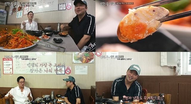 열심히 먹던 전현무는 “요즘 배우들 작품이 없다던데?”라며 근황을 물었고, 류승수는 “작품 제작이 반 이하로 줄었다. 생활이 안 돼서 다들 투잡을 뛴다”고 털어놨다. 이에 전현무는 “형 급도 그러냐?”라고 솔직하게 물었고, 류승수는 “그렇다. 문제가 뭐냐면 주인공과 (조연의) 출연료 차이가 거의 20배가 난다”고 소신 발언했다. 하지만 진지한 분위기 속 전현무는 “형 (출연료가) 얼만데요?”라고 대뜸 돌직구 질문을 던지더니 재차 “아니 그럼 주연이 얼만데?”라고 캐물었고, 류승수는 “(주연은) 적게는 1억 5천만 원에서 많게는 7억 원”이라고 답했다. 이에 전현무는 “1억 5천만 원 나누기 20 하면..”이라며 ‘류승수 출연료’ 계산에 돌입해 폭소를 안겼다. 그러던 중 사장은 싱싱한 ‘아귀 애(간)’을 특식 서비스로 내왔다. 귀한 음식의 출현에 전현무는 “푸아그라보다 맛있다. 진짜 엄청난 음식”이라며 찐 감탄했다.