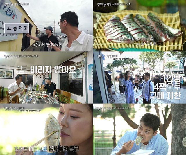 아귀찜 맛집에서 나온 두 사람은 ‘제주 회’를 먹기 위해 류승수의 단골 노포로 향했다. 즉석에서 섭외에 성공한 두 사람은 이내 싱싱한 고등어회를 영접했다. 전현무는 사장표 특제 소스에 쌈 조합을 한입 맛보더니 “미쳤다. 너무 맛있다”며 행복해했다. 이어 두 사람이 진한 전복죽으로 배를 따뜻하게 채웠고, 류승수는 “다음에 제주 올 때는 미리 전화 줘”라며 다음을 기약했다.