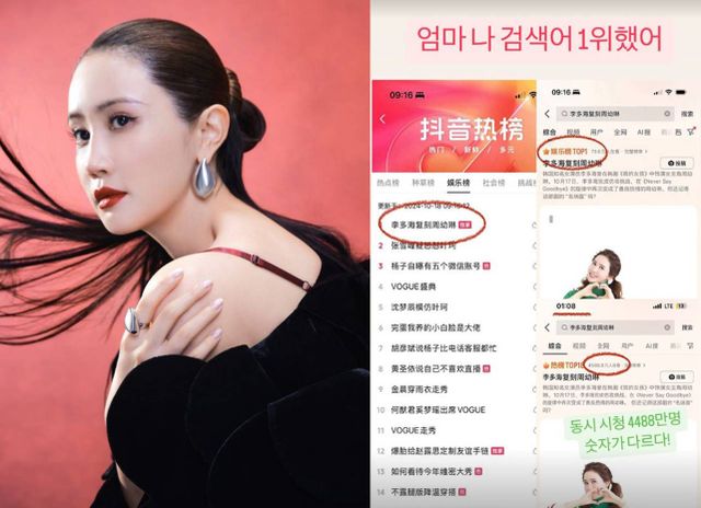 공개된 사진에는 이다해가 중국 검색어 사이트에서 1위를 한 캡처본이 담겼다. 최근 이다해는 "요즘 중국 내에서도 유행인 '중국풍'이 많이 묻어나는 스타일로 작업해 보자고 제안해 줬던 잡지"라며 분위기가 확 달라진 근황을 전하기도 했다.