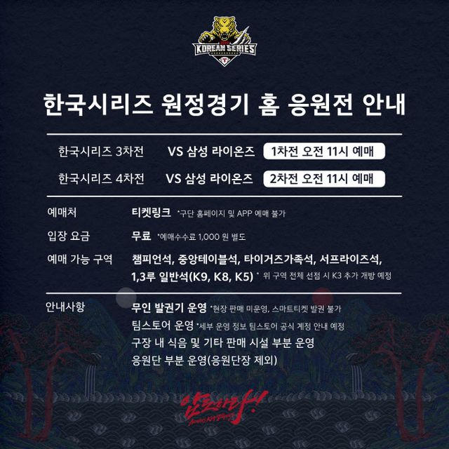 [이데일리 스타in 이석무 기자] KIA타이거즈가 한국시리즈 원정 경기가 열리는 3차전과 4차전에 광주-기아 챔피언스 필드를 팬들에게 개방해 응원전을 펼친다.