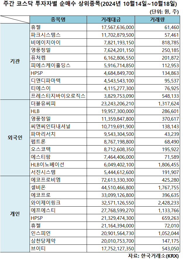 기관 '휴젤'·외인 '더블유씨피'·개인 '에코프로비엠' 1위 [주간 코스닥 순매수- 10월14일~10월18일]