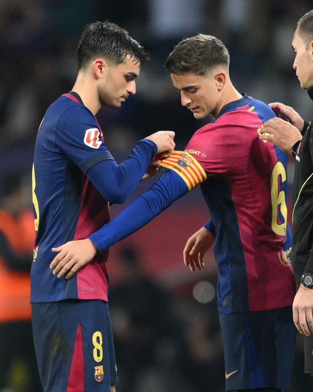지난해 11월 무릎십자인대 파열 등 심각한 부상을 당한 이후 11개월 만에 복귀전을 치른 바르셀로나 파블로 가비(오른쪽). 그의 복귀를 축하해주기 위해 페드리가 주장 완장을 채워주고 있다. 사진=파브리치오 로마노 SNS