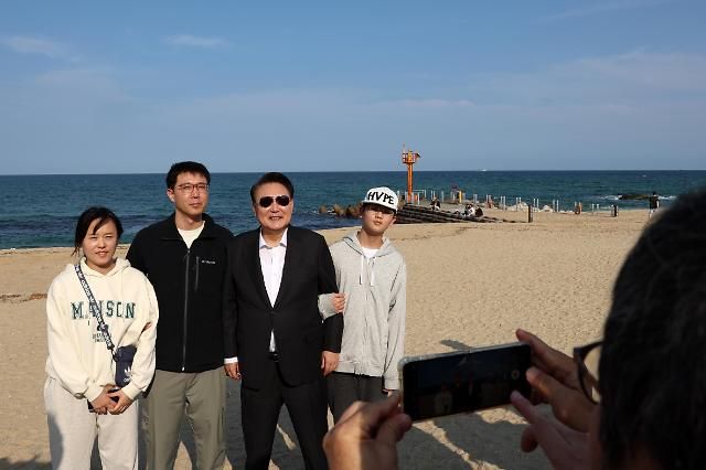 17日,在江原道江陵市的海边,尹锡悦与前来游玩的市民合影留念。【图片提供 韩联社】