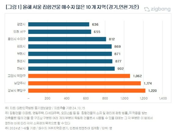 그러면서 "경기, 인천 거주자들의 서울 집합건물 매수 시 지리적으로 인접한 지역 위주로 부동산을 매입했다"며 "직장, 학교 등 기존의 생활권을 어느정도 유지하며 거주 지역에서 멀지 않는 지역의 부동산을 매수하는 것"이라고 분석했다.