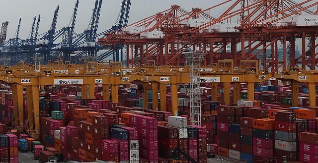 14日下午,釜山江西区釜山港新港码头的堆放场堆满了集装箱。【图片来源 韩联社】