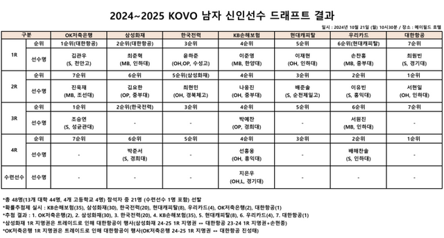 대한항공은 이날 드래프트에 앞서 1라운드 지명권 3장을 보유 중이었다. 지난 6월 진성태를 내주고 OK저축은행의 1라운드 지명권을 받았고, 지난해 삼성화재에 손현종과 2023~24시즌 1라운드 지명권을 주고 2024~25시즌 1라운드 지명권을 얻었다.