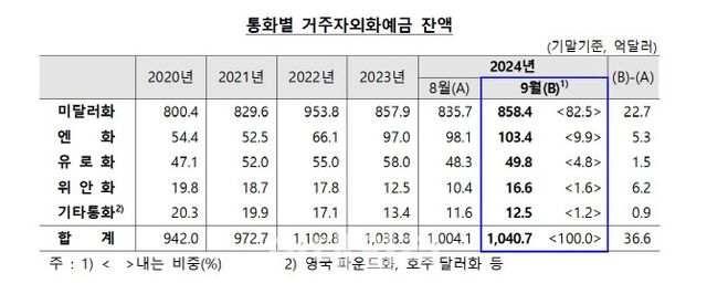 한편, 거주자외화예금은 △내국인과 국내기업 △국내에 6개월 이상 거주한 외국인 △국내에 진출해 있는 외국기업 등의 국내 외화예금을 합한 것이다.