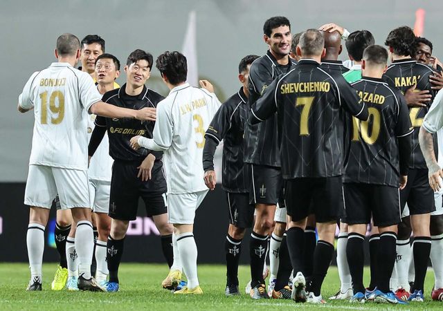 20일 오후 서울 마포구 서울월드컵경기장에서 열린 '2024 넥슨 아이콘매치' FC 스피어와 실드 유나이티드의 경기, 실드 유니이티드의 4대1 승리 후 양팀 선수들이 인사를 나누고 있다. / 뉴스1