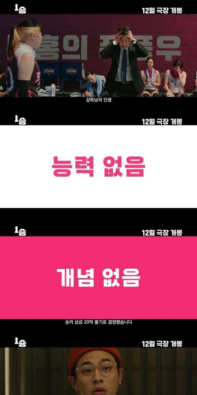 송강호, 박정민의 첫 만남으로 기대를 모으고 있는 영화 ‘1승’이 1차 예고편을 공개했다. ‘1승’은 이겨본 적 없는 감독과 이길 생각 없는 구단주, 이기는 법 모르는 선수들까지 승리의 가능성이 1도 없는 프로 여자배구단이 1승을 위해 도전에 나서는 이야기.