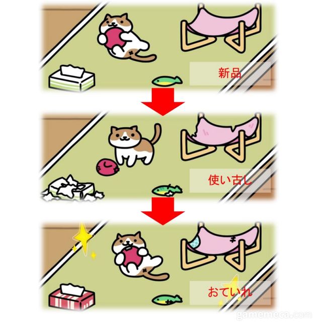 ▲ 고양이가 많이 갖고 논 물건은 망가지며, 이를 고치면 새로운 모습을 볼 수 있다 (자료출처: 네코아츠메 2 공식 홈페이지)