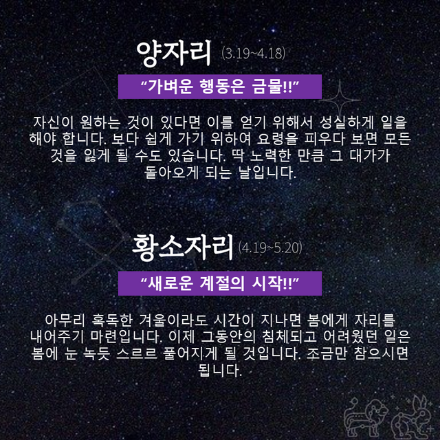 하나의 일을 해결했다고 생각하면 곧바로 다른 일이 당신 앞에 닥치게 되는 날입니다. 한순간도 방심을 할 수가 없으니 조금 피곤할 수도 있겠네요. 계속되는 혼돈 앞에서도 정신을 바짝 차릴 수 있어야 합니다.