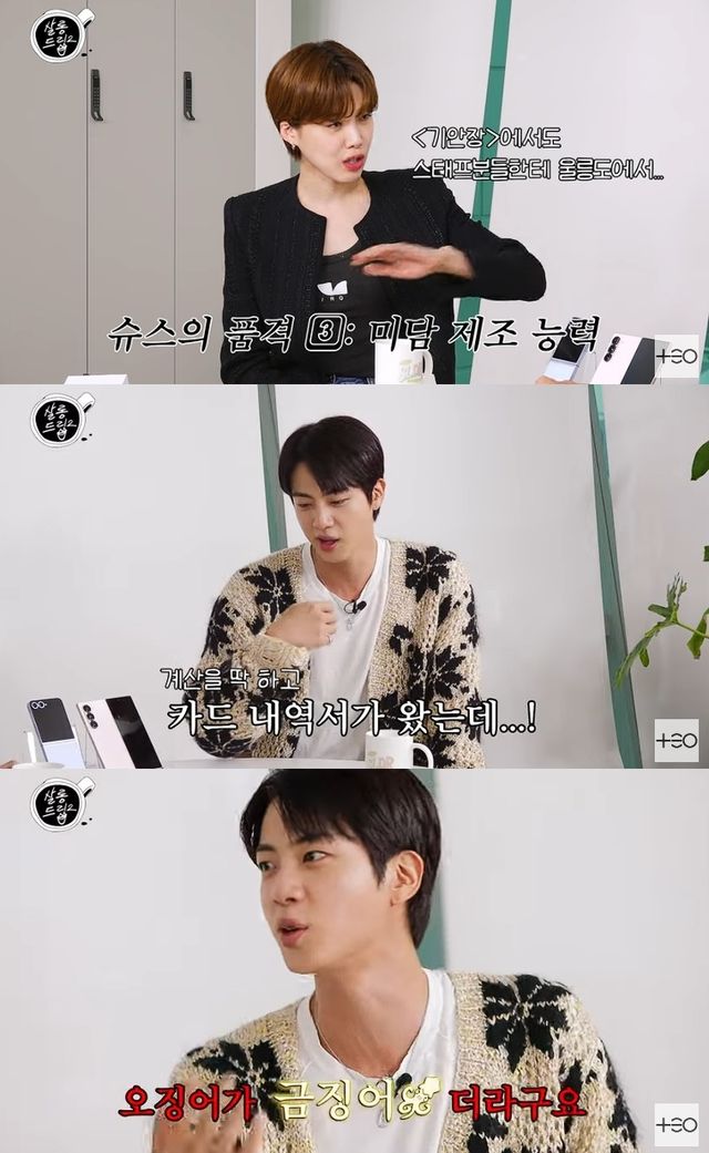 이에 진은 "계산을 하고 카드 내역서가 날아온 걸 보니까 오징어가 금징어더라"며 너스레를 떨었다. 그러면서 "왼손이 좋은 일을 하면 오른발이 끝까지 알아야 한다고 생각한다"며 미담에 대한 소신을 밝히기도 했다.