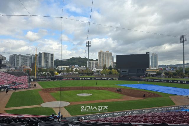 가을비는 그쳤다. 흐린 날씨지만 방수포는 치워졌고 그라운드 정비가 한창이다. 23일 열리는 한국시리즈(KS) 1·2차전은 열릴 수 있을까.