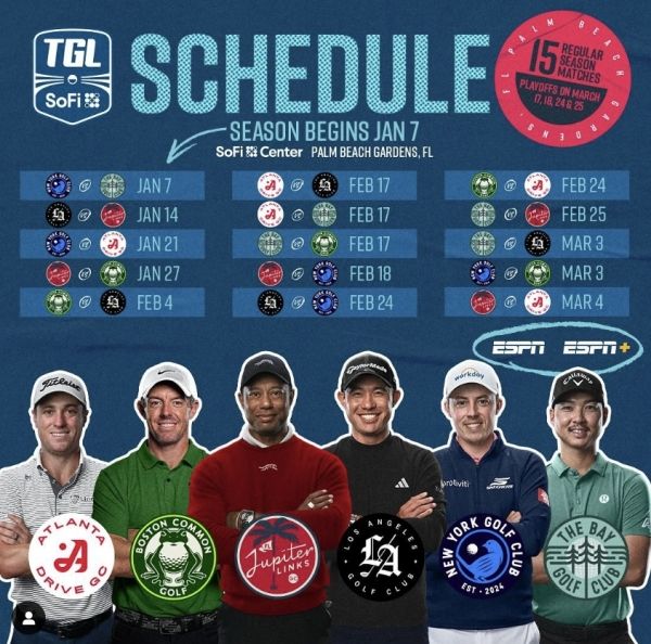 TGL은 정규 시즌 15경기(팀당 5경기), 4팀이 펼치는 준결승, 그리고 3월 24일과 25일, 이틀 동안 3전 2선승제로 진행되는 결승 시리즈로 구성된다. 모든 경기는 미국의 스포츠 전문 방송사인 ESPN, ESPN2를 통해 중계되고, ESPN+를 통해 스트리밍될 예정이다.
