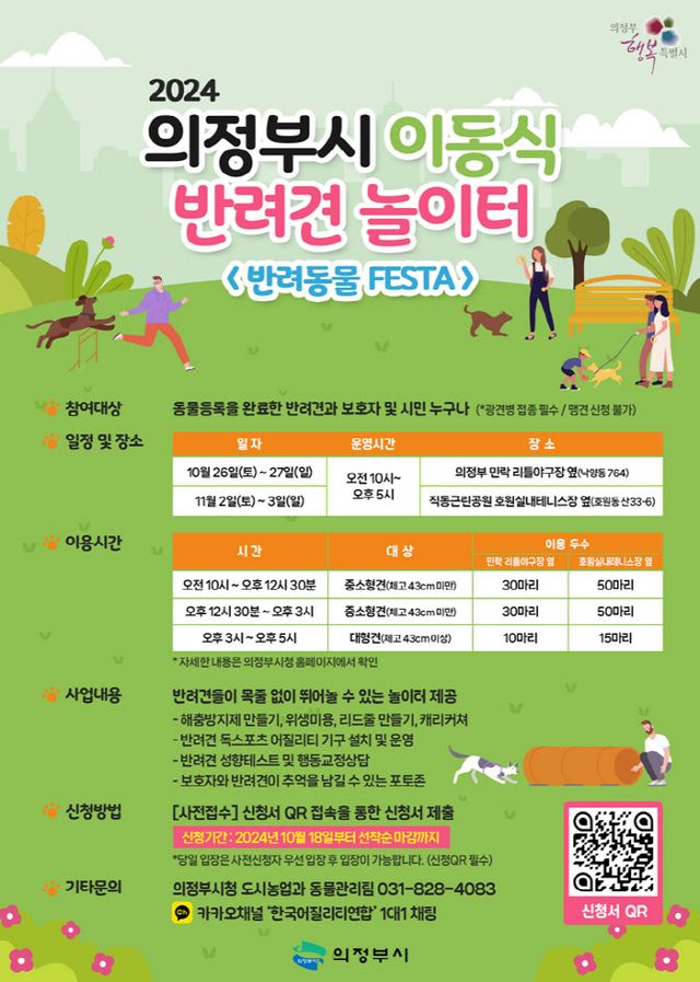 경기 의정부시는 10월 26일부터 11월 8일까지 ‘이동식 반려견 놀이터(반려동물 페스타)’를 운영한다고 23일 밝혔다.