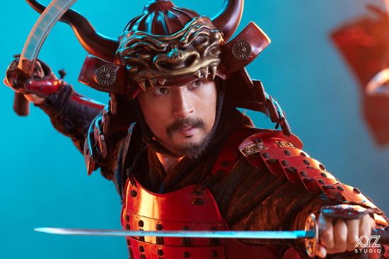 도깨비를 연상하게 했던 겐신의 트레이드 마크이자 극 중 조선 의병들을 두려움에 떨게 했던 뿔 달린 투구를 눌러쓴 채 장검과 단검을 양손에 쥐고 포즈를 취하는 모습은 극 중 캐릭터와 높은 싱크로율을 보여준다.