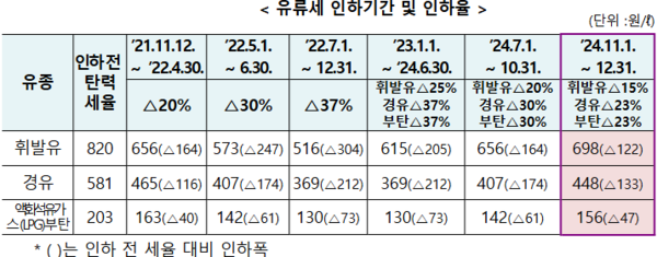 이번 조치에 따라 유류세 한시적 인하 전 대비 휘발유 △122원/리터(ℓ), 경유 △133원/리터(ℓ), 액화석유가스(LPG)부탄 △47원/리터(ℓ)의 세부담이 경감된다.