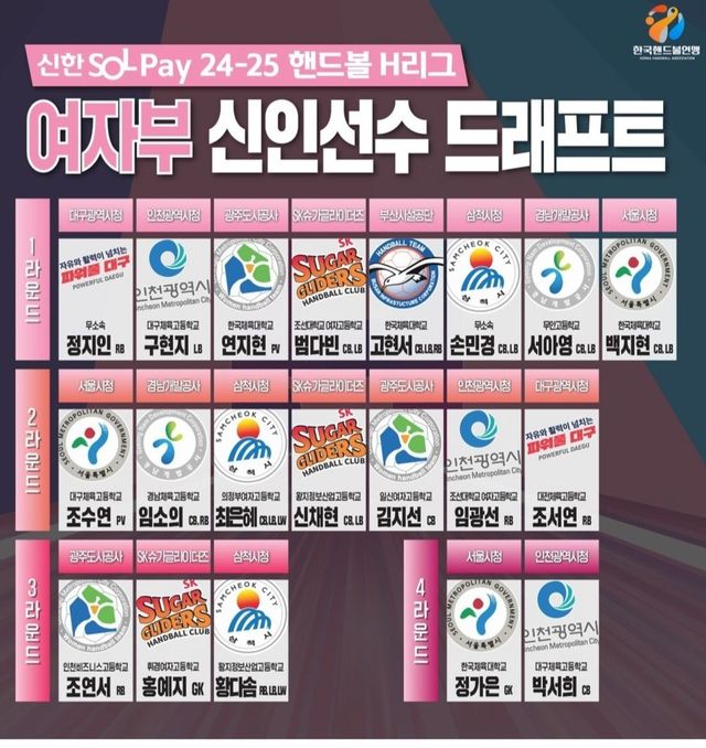 신인 드래프트 여자부 전체 2순위 지명권을 얻은 인천시청은 대구체고 레프트백 구현지(18·176.1cm)를 지명했다. 3순위 광주도시공사는 한국체대 피벗 연지현(22·176.1cm), 4순위 SK슈가글라이더즈는 조대여고 센터백 범다빈(18·175cm)을 각각 선발했다.