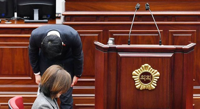 음주운전으로 물의를 일으킨 강경흠 제주특별자치도의회 의원(제주시 아라동 을·더불어민주당)이 지난해 3월 29일 오전 제414회 임시회 제1차 본회의에서 공개 사과하고 있다. 도의회는 이날 본회의에서 강 의원에 대한 징계의 건(공개회의에서의 사과·30일 출석정지)을 가결했다 / 뉴스1(제주도의회 제공)