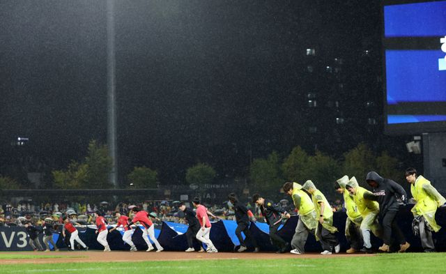 KBO의 결단이 늦어지는 사이, 방수포는 빗줄기에 따라 네 번이나 깔렸다 치워졌다를 반복했다. 그라운드 보호와 빠른 경기 개시를 위해선 빠른 방수포 설치 및 철거가 필요한데, 가로-세로 52m 크기의 대형 방수포를 빠른 시간 내에 설치하는 건 상당한 힘이 따른다. 구장 직원들이 이를 온전히 감당해야 했다. 우비 하나에만 의존하거나 아예 보호 장비 없이 그라운드로 달려나가 이 작업을 반복했다.