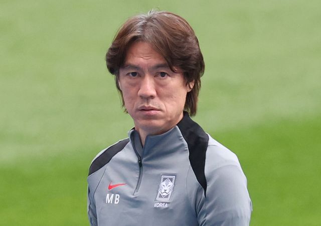 북중미 월드컵 아시아지역 예선 이라크전을 앞둔 한국 축구 국가대표팀 홍명보 감독이 지난 14일 경기도 용인미르스타디움에서 선수들의 훈련 과정을 보고 있다. / 연합뉴스