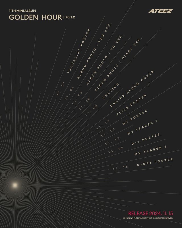 공개된 포스터에 따르면 에이티즈는 11월 15일 미니 11집 ‘골든 아워 : 파트 2’를 발매, 11월 1일 트랙리스트 포스터를 시작으로, 앨범 포토, 프리뷰, 타이틀 포스터, 뮤직비디오 티저 등 다양한 티징 콘텐츠를 연일 풀어내며 컴백 열기를 더해갈 예정이다.
