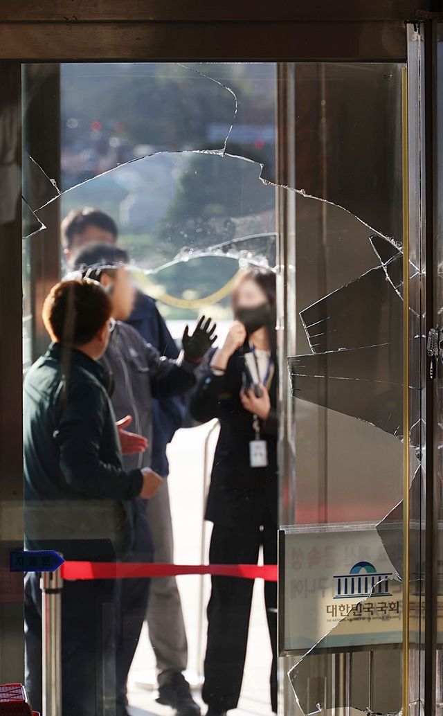 25일 오전 서울 여의도 국회의사당 본관 출입문 유리가 파손돼 관계자들이 이를 수습하고 있다. 이날 오전 5시15분쯤 한 남성이 유리문에 소화기를 던지고 안내 입간판으로 본관 일부를 부숴 경찰에 체포됐다. / 연합뉴스