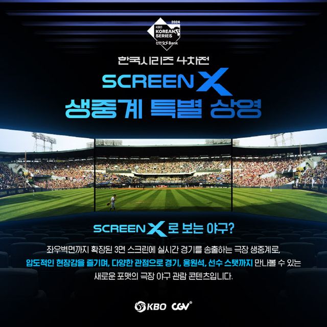 KBO는 오는 26일 오후 2시 대구 삼성라이온즈파크에서 열리는 2024 신한SOL뱅크 KBO 한국시리즈 4차전을 CGV 스크린X 특별관에서 생중계한다고 24일 밝혔다.