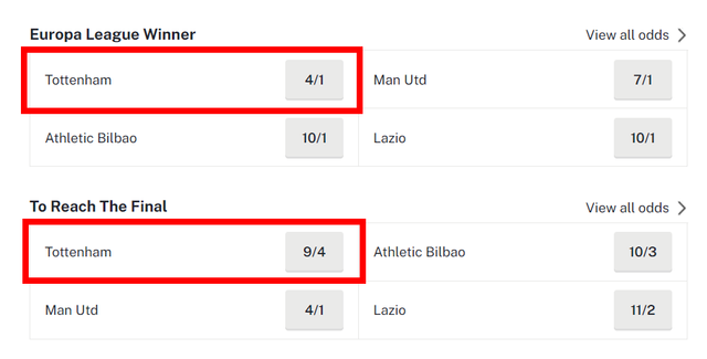 25일 베팅업체 확률을 모아놓은 오즈체커에 따르면 토트넘은 유로파리그에서 우승할 확률이 4대1 즉 25%에 달해 2위권을 큰 격차로 따돌리며 1위를 달리고 있다. 아직 리그 페이즈 기간임에도 1.5군으로 다른 팀들을 압도하는 토트넘의 경기력을 보면서 베팅업체는 10~15% 수준이었던 우승 확률을 대폭 상향 조정한 것이다.