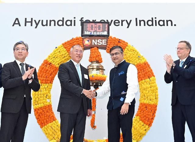 22日,现代汽车集团首席执行官郑义宣出席印度证券交易所(NSE)举行的印度法人上市纪念仪式,与印度证券交易所(NSE)首席执行官阿希什·乔汉(Ashish Chauhan)握手。【图片来源 韩联社】