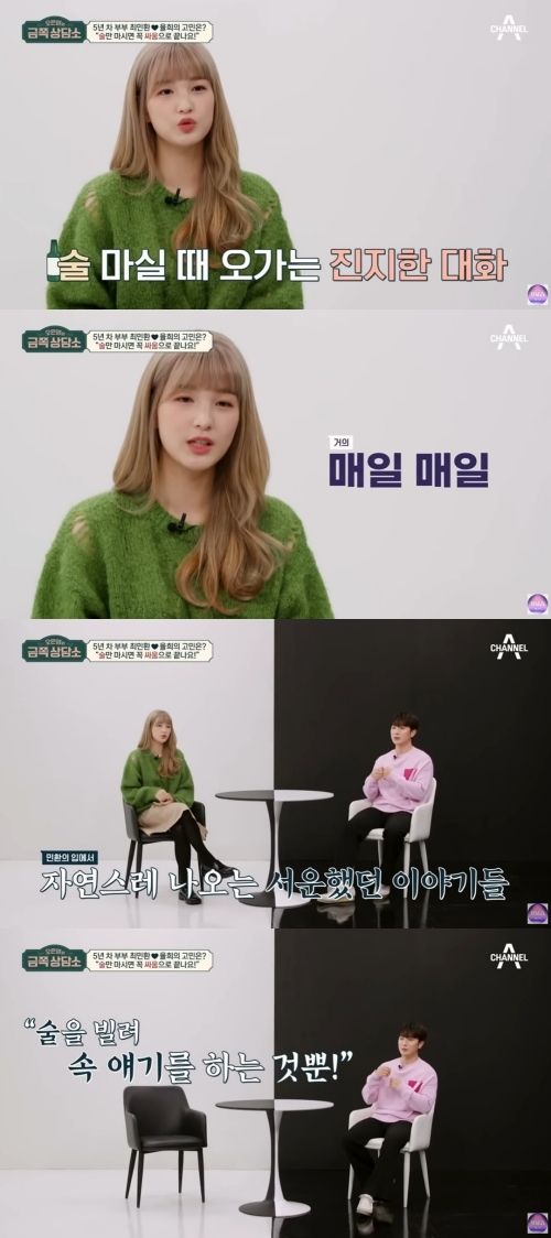 둘이 갈등한 이유는 이뿐만이 아니었다. 율희는 "남편이 술을 마시면 서운한 말을 한다. 서로 작은 말에도 예민하게 반응해 싸움으로 이어진다. 진지한 대화를 나누지 못한다"라고 밝혔다. 최민환은 "술김에 솔직한 이야기를 할 뿐이다"라고 해명했다. 그러자 오은영은 "대화 방식의 문제"라며 "상대의 말 핵심을 파악하는 것이 중요하다. 서로를 인정하고 균형점을 찾아야 한다"라고 했다.
