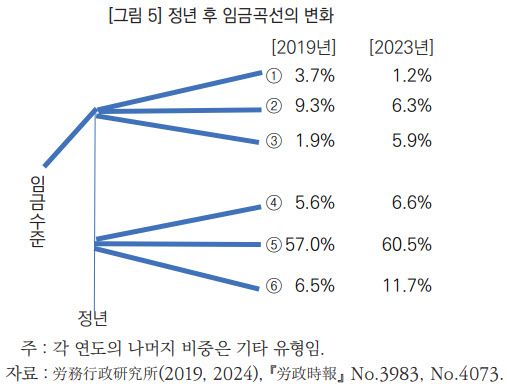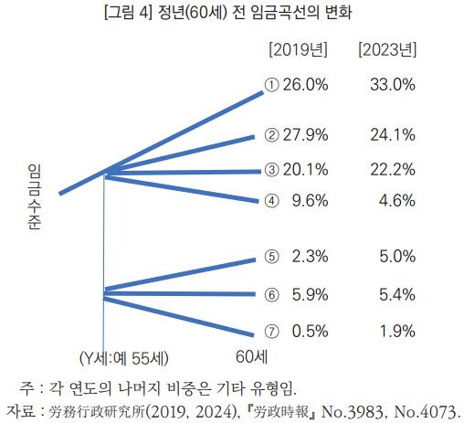 일본 기업 10곳 중 8곳(78.8%)은 정년에 도달한 시점에 임금이 급감한 것으로 나타났다. 60.5%는 급감한 이후 일정 수준을 유지하고 11.7%는 급감한 이후에도 줄어들었다. 정년 시점의 임금을 기준으로 상승(1.2%)하거나 유지(6.3%)하거나 감소(5.9%)한 기업은 10곳 중 1곳(13.4%)에 그쳤다.