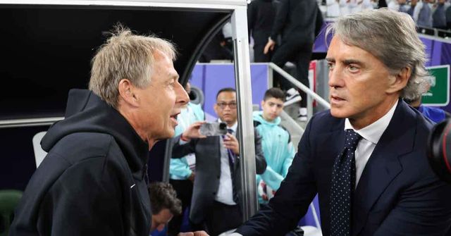 위르겐 클린스만 감독과 로베르토 만치니 사우디아라비아 감독이 30일(현지시간) 카타르 알라이얀 에듀케이션 시티 스타디움에서 열린 2023 아시아축구연맹(AFC) 카타르 아시안컵 16강전 대한민국과 사우디아라비아의 경기에 앞서 인사를 나누고 있다. / 뉴스1