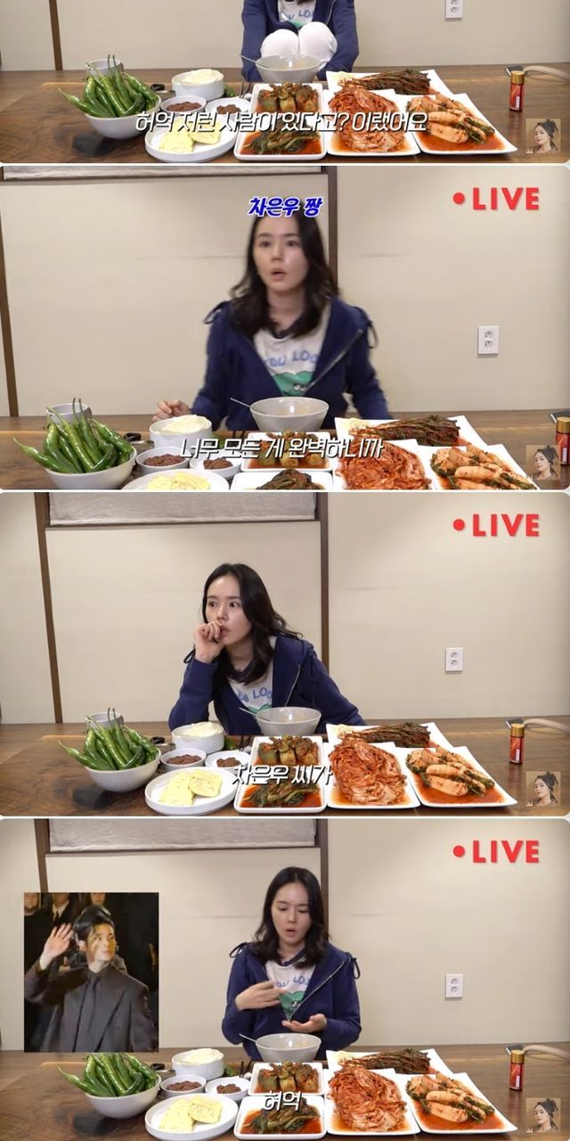 한가인은 "구독자 15만명을 넘은 기념으로 QNA 시간도 갖고 김치 먹방도 할겸 라이브를 하겠다. 라방 처음이라 떨린다"라고 인사했다.
