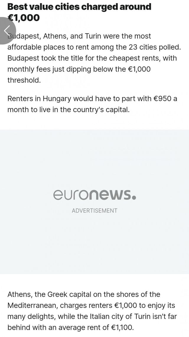 아님. 그 밑문단에 유럽에서 월세가 가장 저렴한 도시들도 꼽아놓았는데 헝가리 부다페스트, 그리스 아테네, 이탈리아 토리노임.