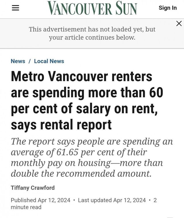 [ " 세전" 월급 61.65% 를 월세로 낸다는 캐나다 밴쿠버 주민들 ]