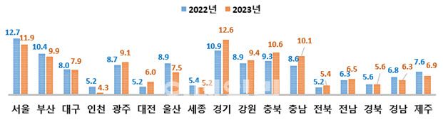 부채비율이 가장 높은 곳은 경기였다. 2022년 10.9%였던 것이 2023년 12.6%로 1.7%포인트 상승했다. 그 뒤를 △서울(11.9%) △충북(10.6%) △충남(10.1%) △부산(9.9%) △강원(9.4%) △광주(9.1%) 등이 뒤를 이었다.