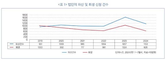 27일 대법원에 따르면 올해 7월까지 법인의 파산 신청 건수는 1153에 달했다. 1월부터 7월까지 신청 기준으로 2014년 이후 최대다. 역대 가장 많은 법인이 파산했던 지난해(1657건)의 70%에 달한다. 7개월 만에 지난해 연간 파산 건수를 웃돈다. 금융연구원에선 이런 추세가 연말까지 이어져 역대 최대를 기록할 것으로 예상했다.