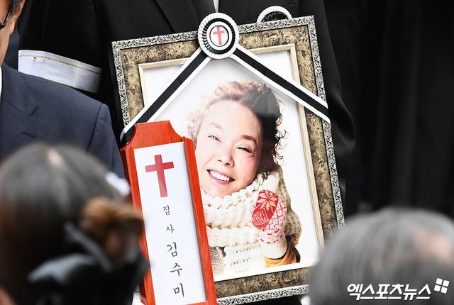 영정사진이 된 2011년 영화 '그대를 사랑합니다' 포스터 속 목도리를 두른 채 환하게 웃고 있는 고인의 모습이 먹먹함을 유발한다. 고인은 생전 "내가 죽거든 어느 장례식장에서도 볼 수 없는 영정사진을 갖고 싶다"며 "사람들이 '죽을 때 까지 김수미답게 가는구나' 이렇게 생각하면서 영정사진을 봤을 때 웃게 하고 싶다"는 말을 전한 바 있다.